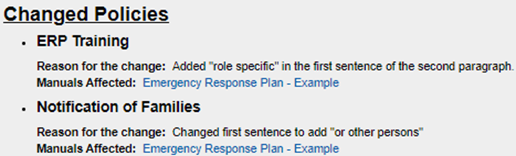 Click on the Notification and you'll notice the Changed Policies area. The policy name, reason for the change, and the manual affected are listed.
